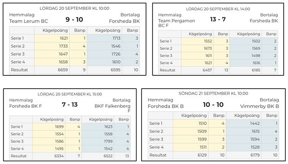 Hemma match mot BKF Falkenberg F som förra säsongen var ett topplag i Allsvenskan men p.g.a. att deras A-lag åkte ur Elitserien och ner till Allsvenskan så får de inte vara kvar där utan måste denna säsong spela i div.1. Det blev en tuff match för vårt F-lag och det slutade med förlust 7-13. Filip var klart bäst individuellt med 930p, Niclas (831p) och Janne (824p) vann 3 banpoäng.